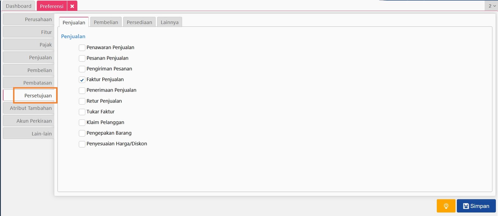 Berikan tanda centang pada setiap jenis transaksi yang memerlukan fitur persetujuan, kemudian simpan.