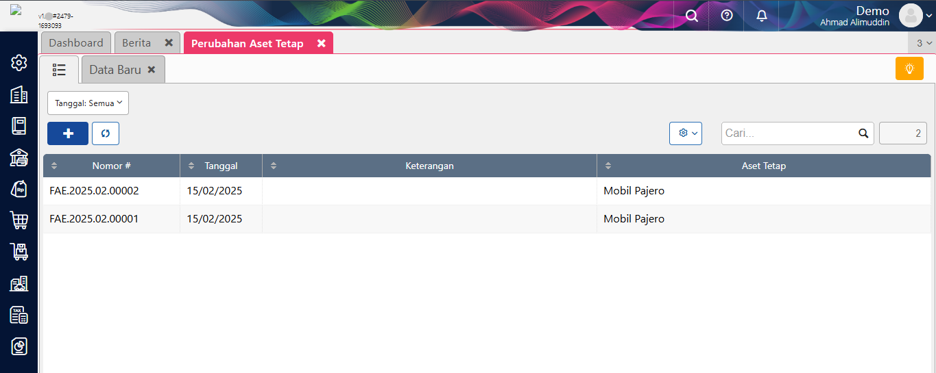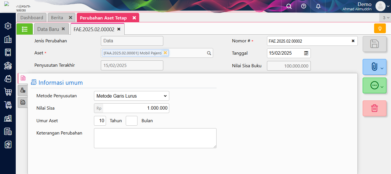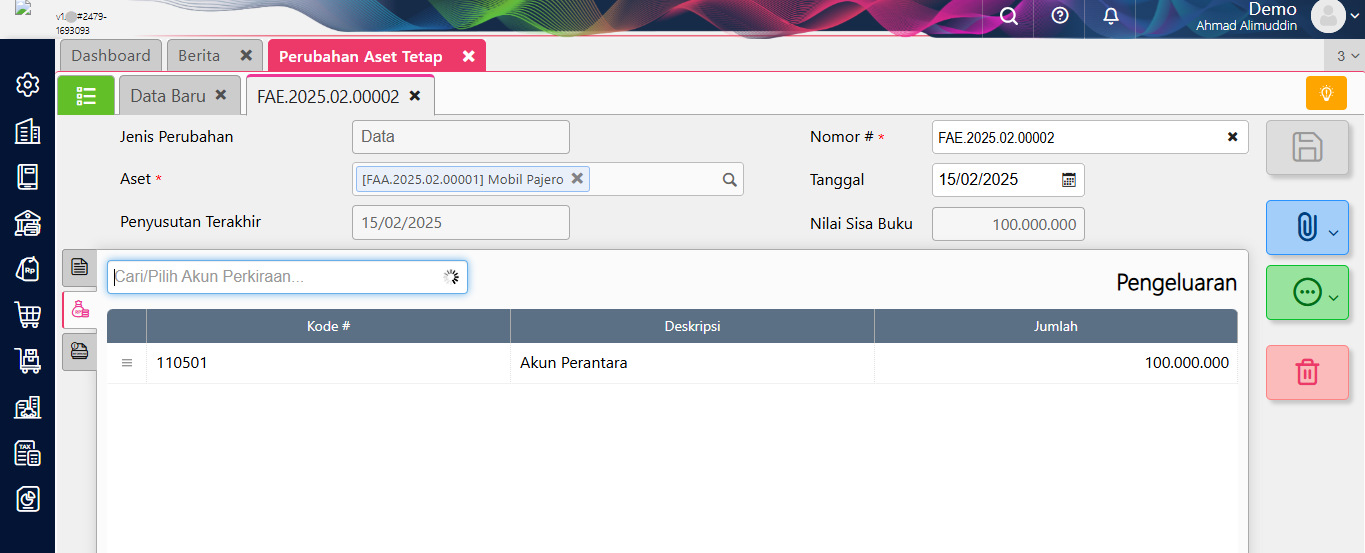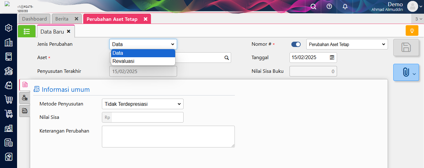- klik field Aset lalu tentukan nama Aset Tetap yang akan dilakukan perubahan.