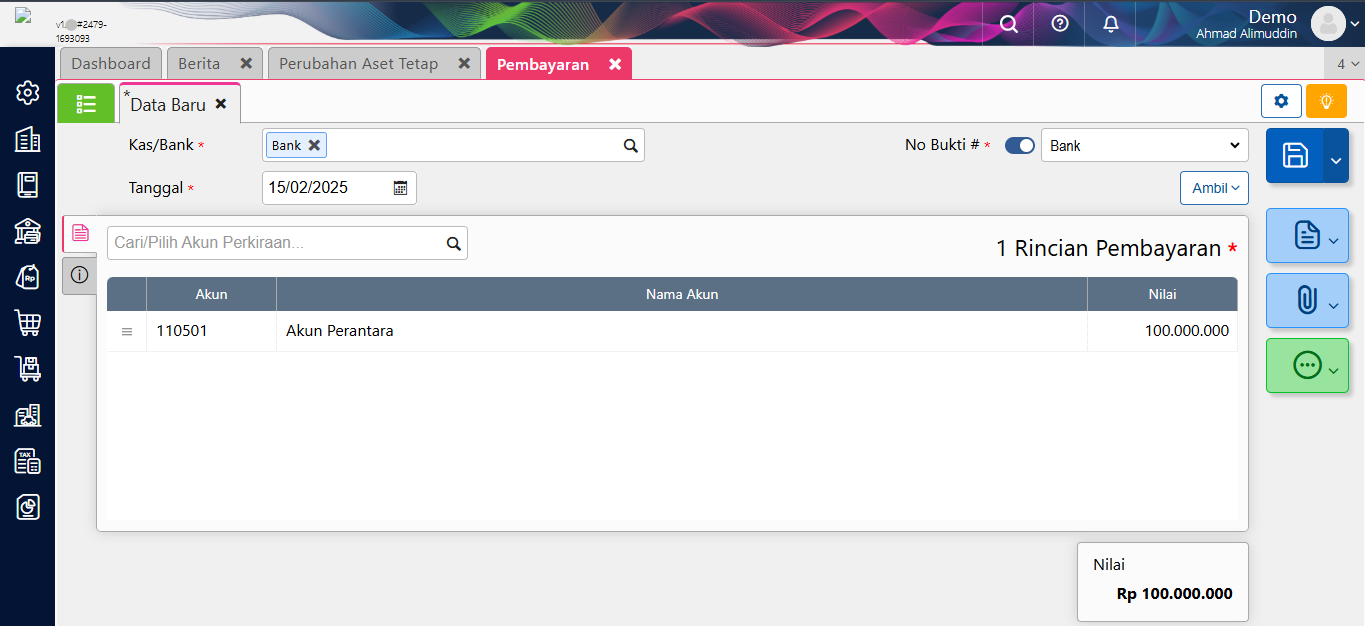 - Klik tab Pengeluaran, klik Cari/Pilih Akun Perkiraan, lalu masukan akun perantara yang digunakan untuk mengeluarkan dana sumber renovasi beserta jumlahnya. Misalkan menggunakan akun bertipe aset lancar lainnya dan jurnal di menu kas & bank | pembayaran :