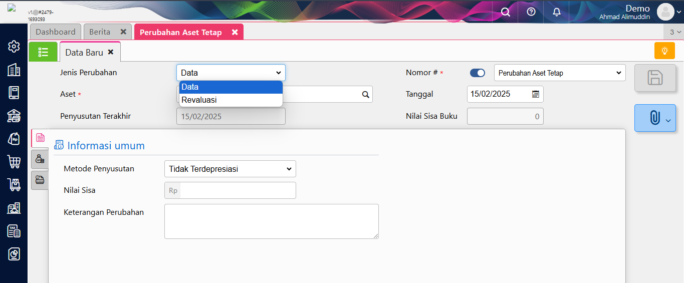 Contohnya, ada aset tetap sudah disusutkan sampai dengan saat ini dan nilai bukunya masih senilai 500.000.000, tetapi jika dilakukan taksiran atas aset tetap tsb nilainya masih 650.000.000, ,maka Anda bisa menggunakan fitur Perubahan Aset Tetap – Revaluasi untuk mengubah nilai dari 500.000.000 menjadi 650.000.000
