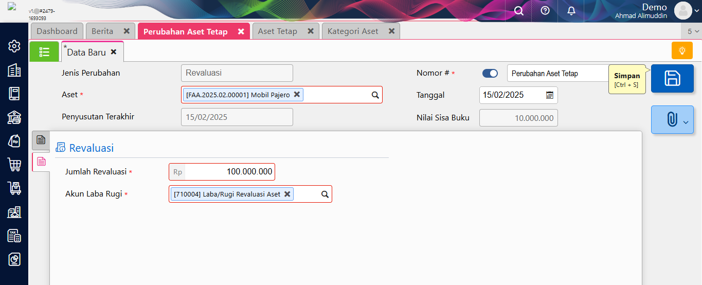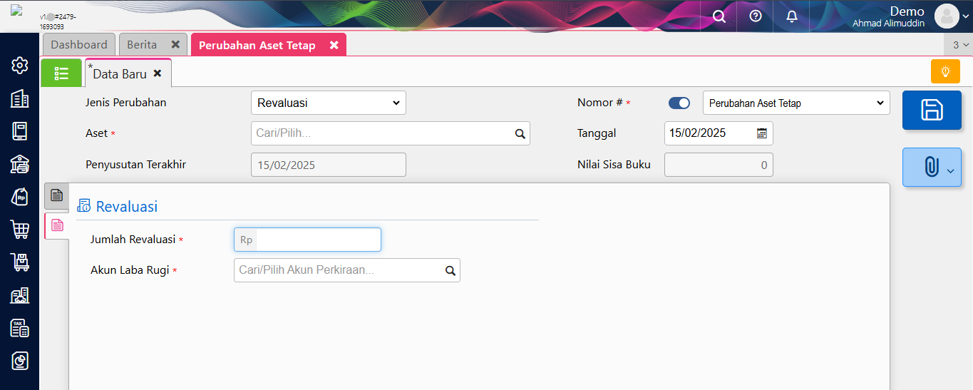 1. Pada tab Revaluasi, field Jumlah isi dengan nilai yang diinginkan, sedangkan pada Akun Laba Rugi, isi dengan akun penampung laba rugi atas proses revaluasi tsb.