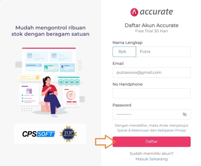 1. Lengkapi formulir Pendaftaran Akun Baru, yang terdiri dari Nama, Nomor Handphone, Email dan Password dan selanjutnya klik Daftar.
