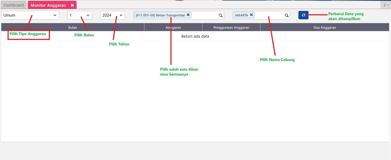 Untuk bisa menampilkan Monitor Anggaran, pastikan Anda telah Membuat Anggaran Akun pada database Anda.