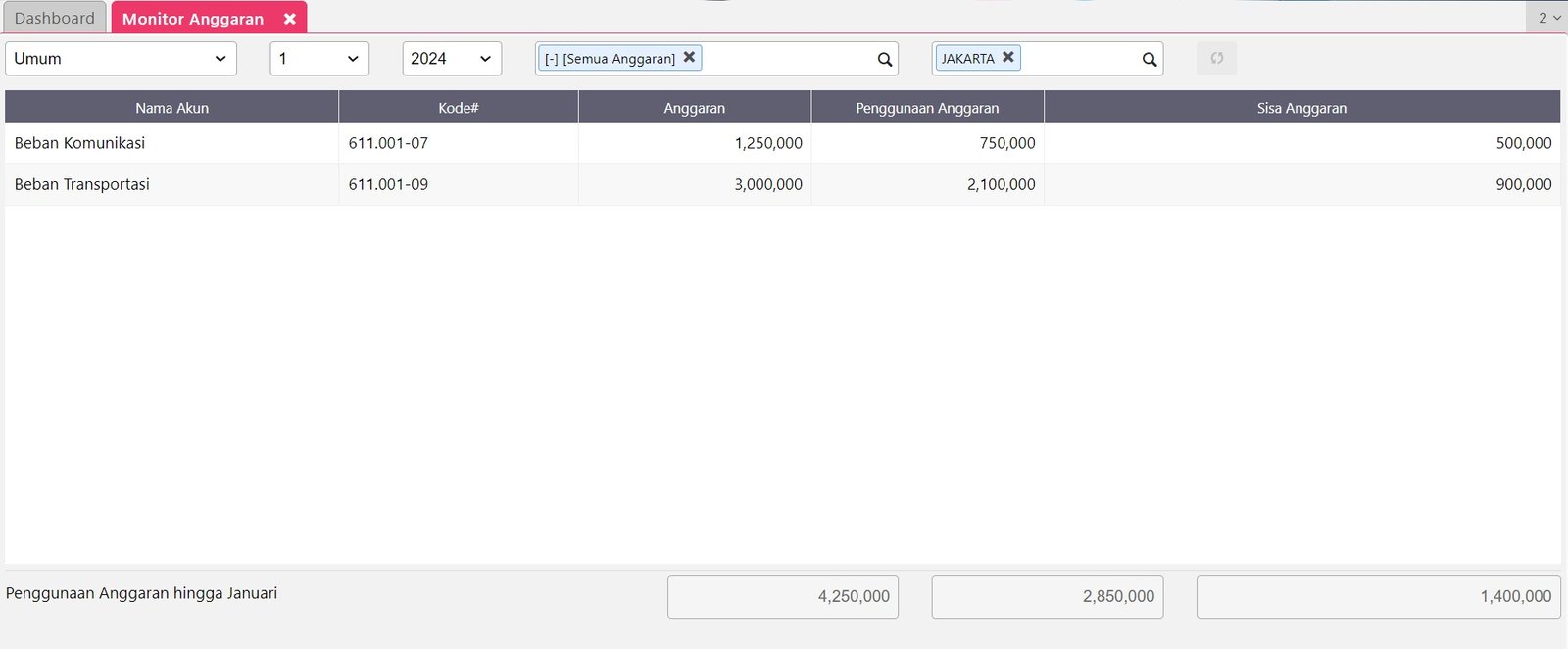 Monitor Anggaran untuk akun tertentu akan tampil sebagai berikut.