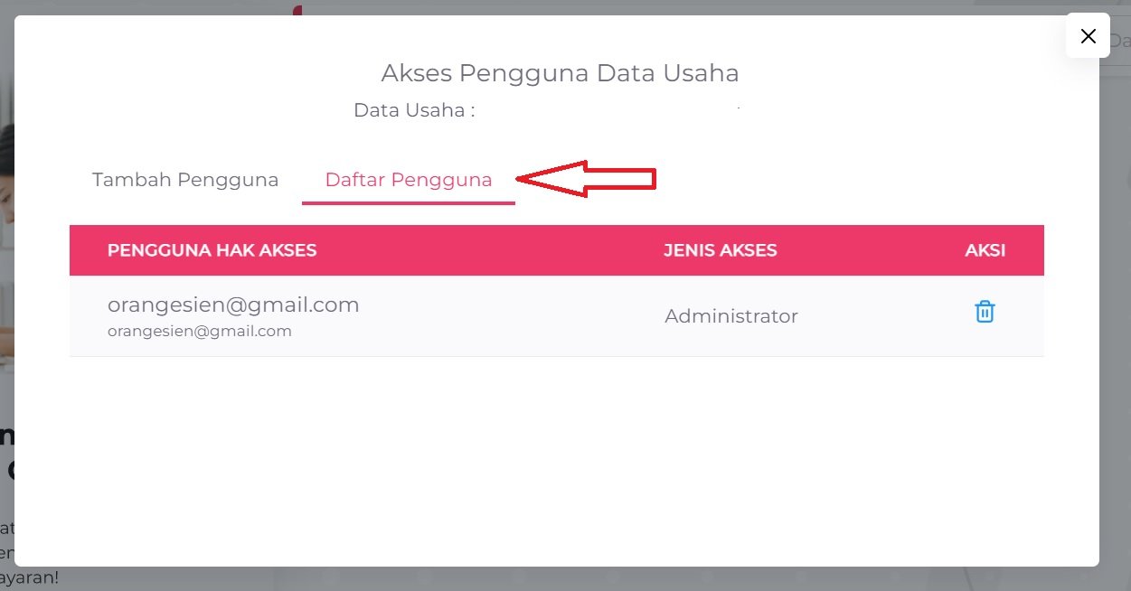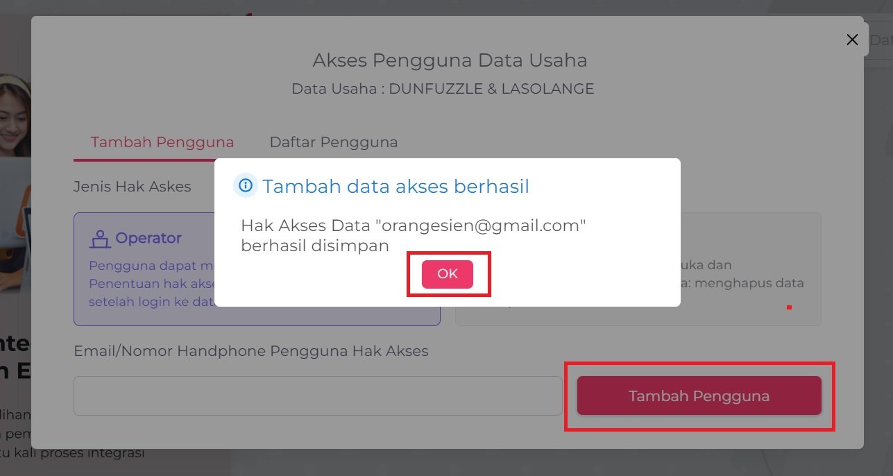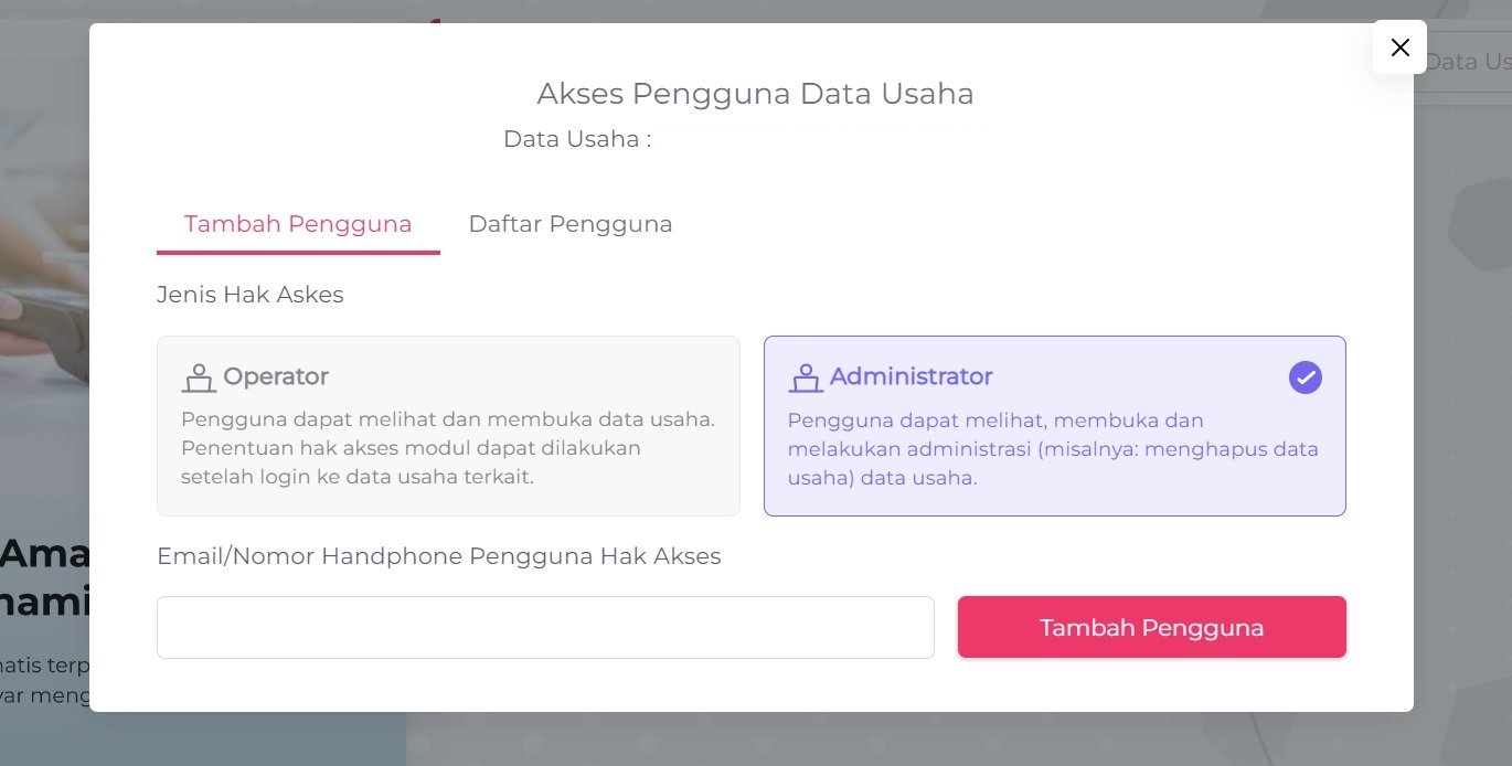 4. Selanjutnya pada bagian “Email/ Nomor Handphone Pengguna Hak Akses” isi dengan akun email/ Nomor Handphone staff atau pengguna lain yang akan diberikan akses kedalam database, lalu klik Tambah Pengguna.