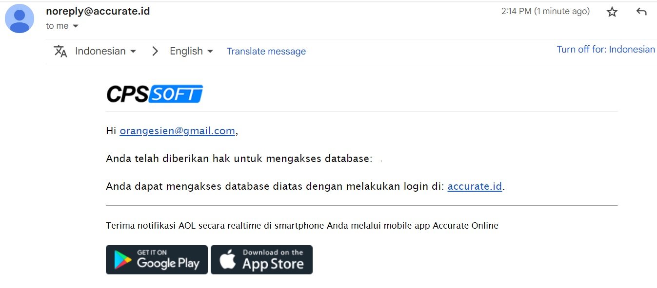 6. Pengguna yang diberikan akses, akan mendapat email notifikasi seperti di bawah ini, jika pengguna tsb sudah pernah mendaftarkan id emailnya ke accurate.id.