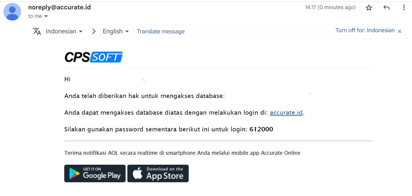 7. Pengguna yang belum pernah mendaftarkan id emailnya ke accurate.id, maka ketika diberikan akses, akan mendapatkan email yang sedikit berbeda. Perbedaan terdapat pada informasi password sementara.